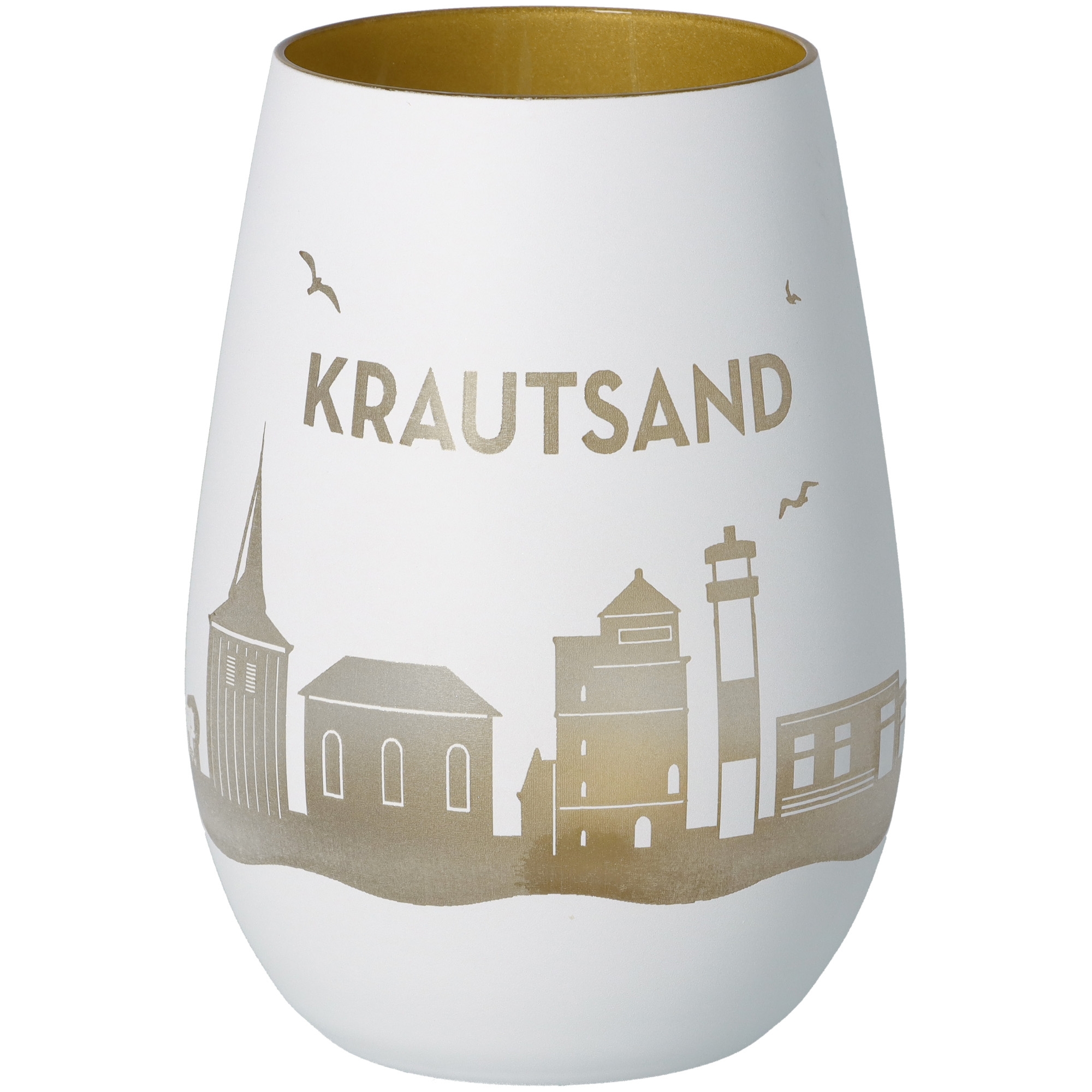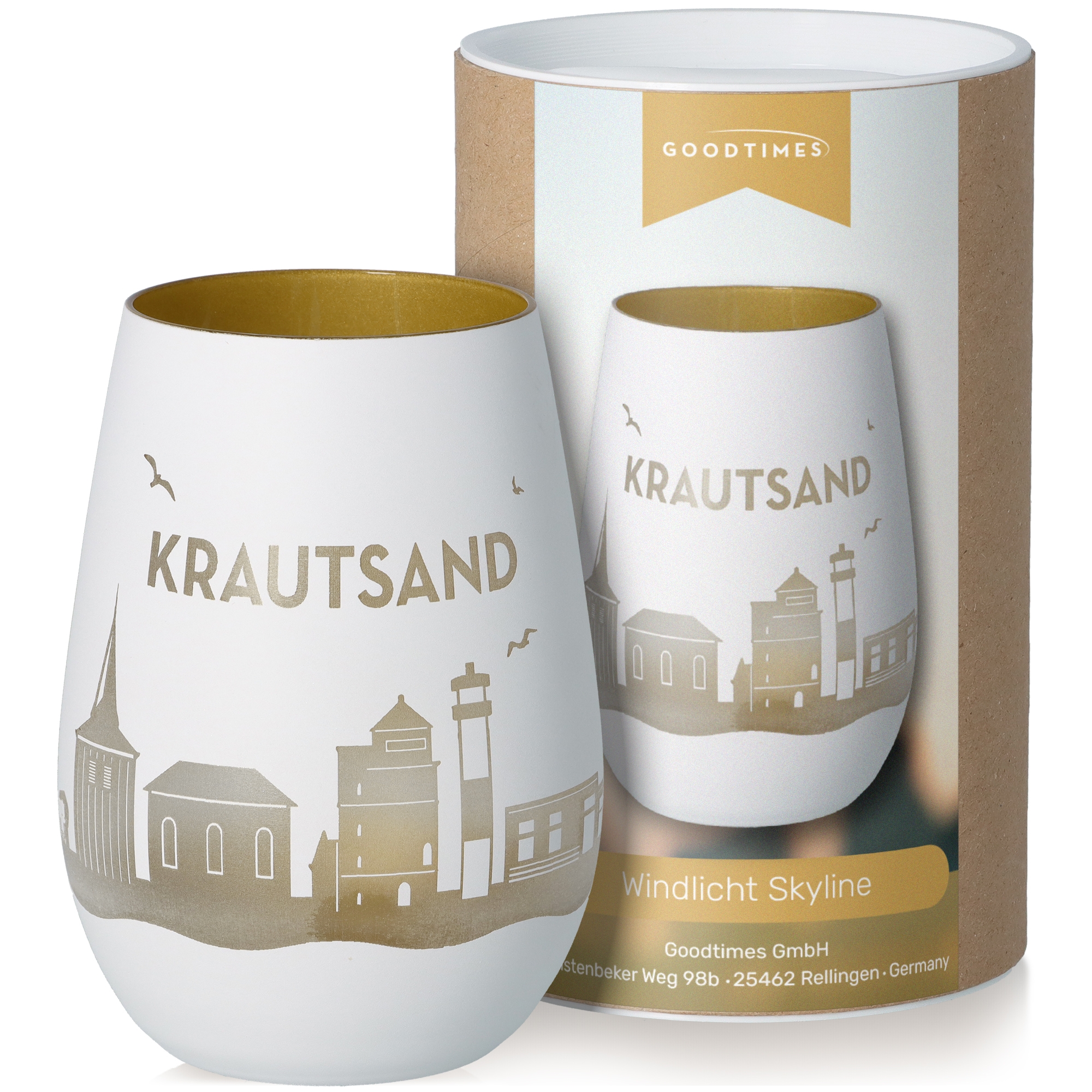 Die perfekte Geschenkidee ist unser Windlicht mit einer rundum Gravur von der Krautsand Skyline, welche mit Kerzenlicht extra heraussticht.